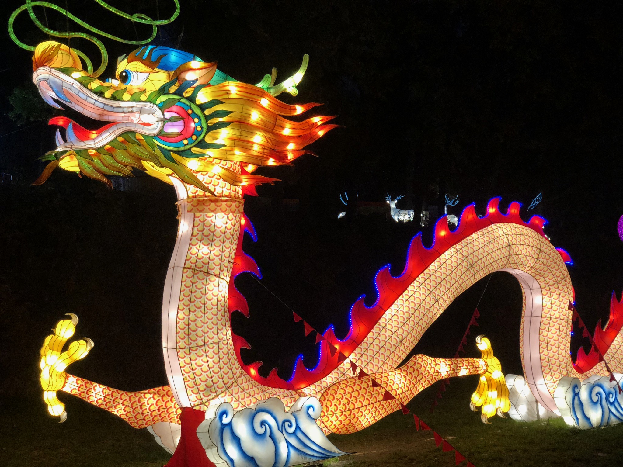 Вечером для посетителей зажгли более 30 световых инсталляций, среди которых: сады панд, оленей и райских птиц, красочные фигуры розовых фламинго и восточных слонов, аллея влюбленных и многое другое. Любимцем гостей фестиваля стал 40-метровый огнедышащий дракон.